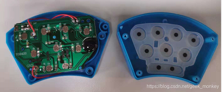 黑色的一坨就是个单片机,可能比8051还要陈旧。按钮是两片裸露的铜皮,且没无间接毗连,是个断路,而按键的橡胶是导电的,按下去当前,把两篇铜皮短路掉,单片机就能够检测到变化了。至于LED,哪无LED?也就是一小截灯丝而未。