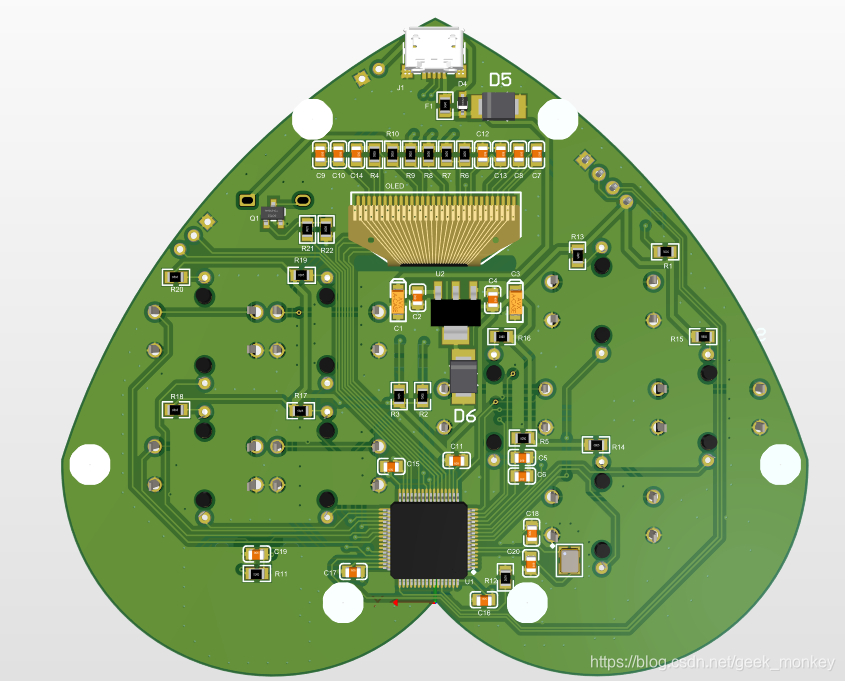 心形PCB,自我感受还不错。按键的位放都试验过,配上无机玻璃,也比力随手。现实上买了蓝色的OLED,颜值也不错 。