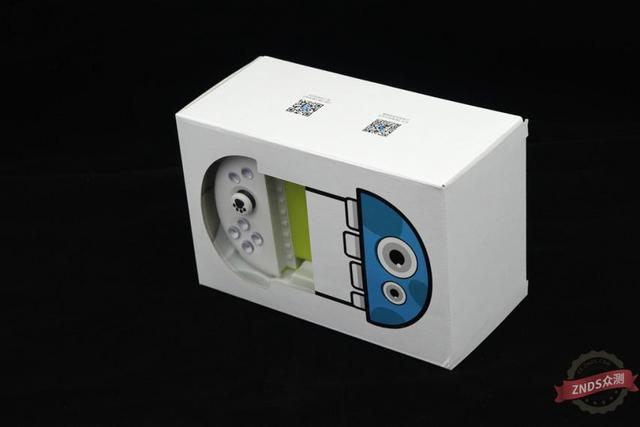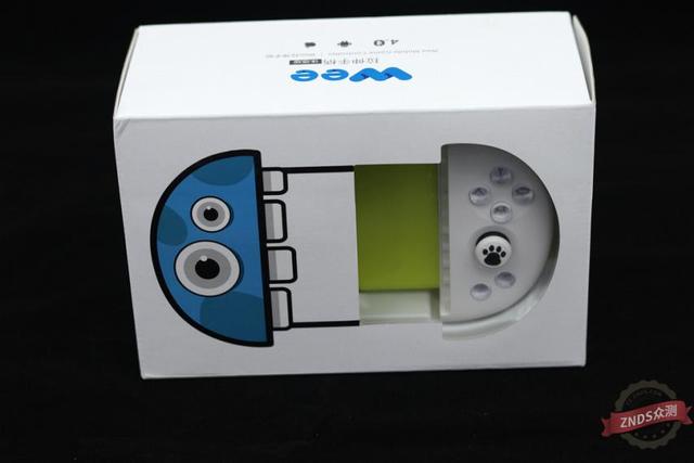 手柄外包拆为犹抱琵琶半遮面设想,一侧通明,显露手柄左半部,左半部设想像一个蓝色露牙小怪兽。全体外包拆盒为白色纸盒。